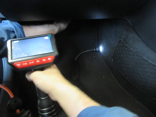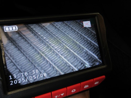 スコープ付きのガンでエバポレーターの汚れを確認しながら
