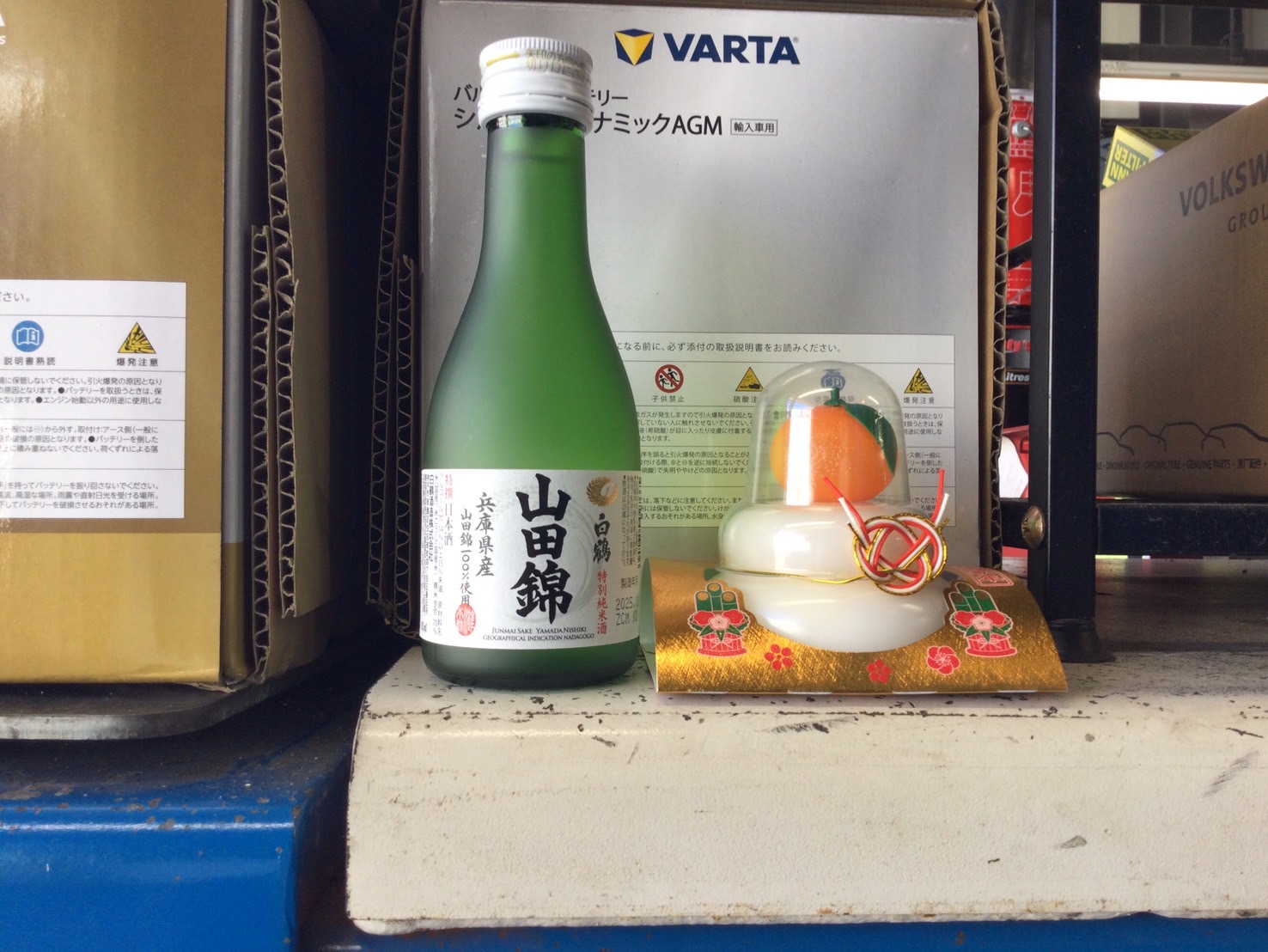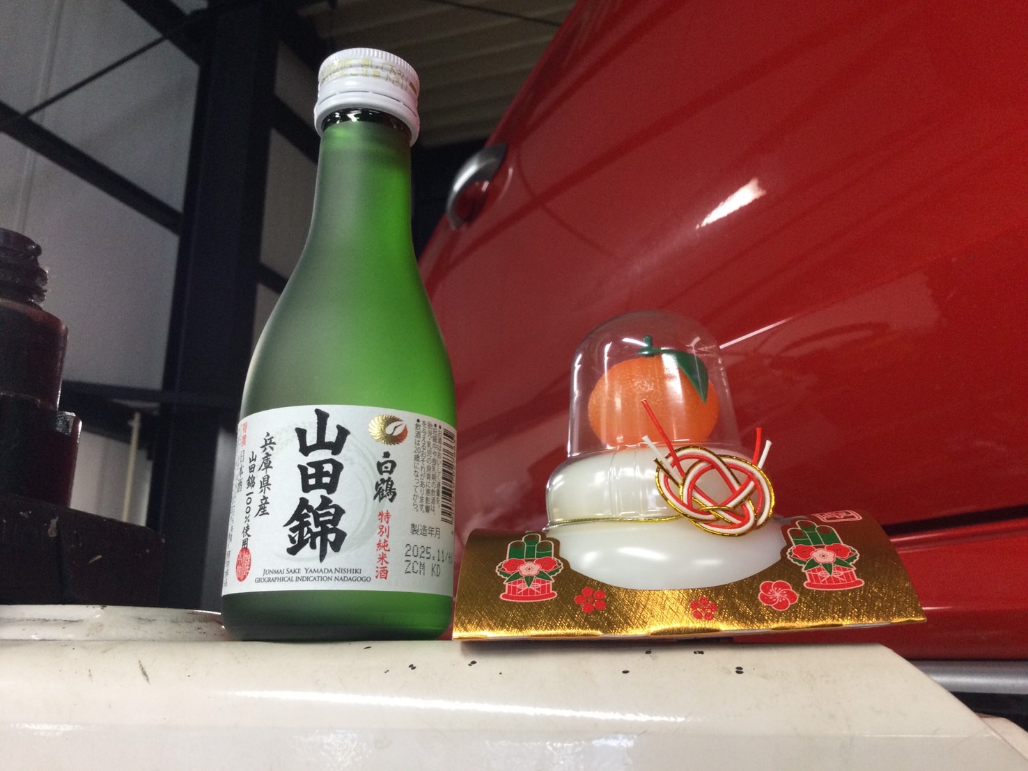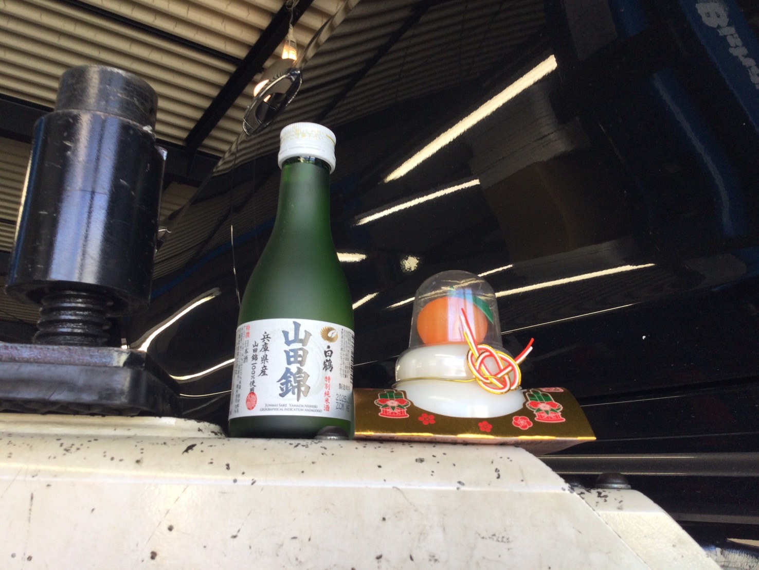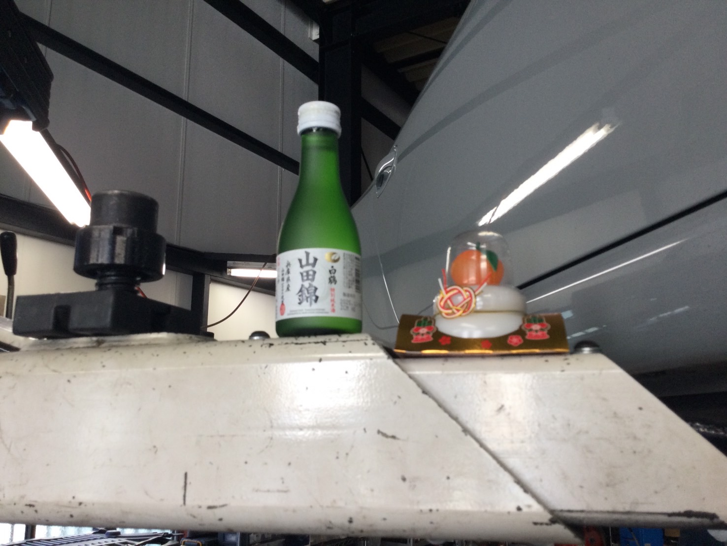 2026年も安全に作業できるようにリフトにはお神酒と鏡餅をセットします
