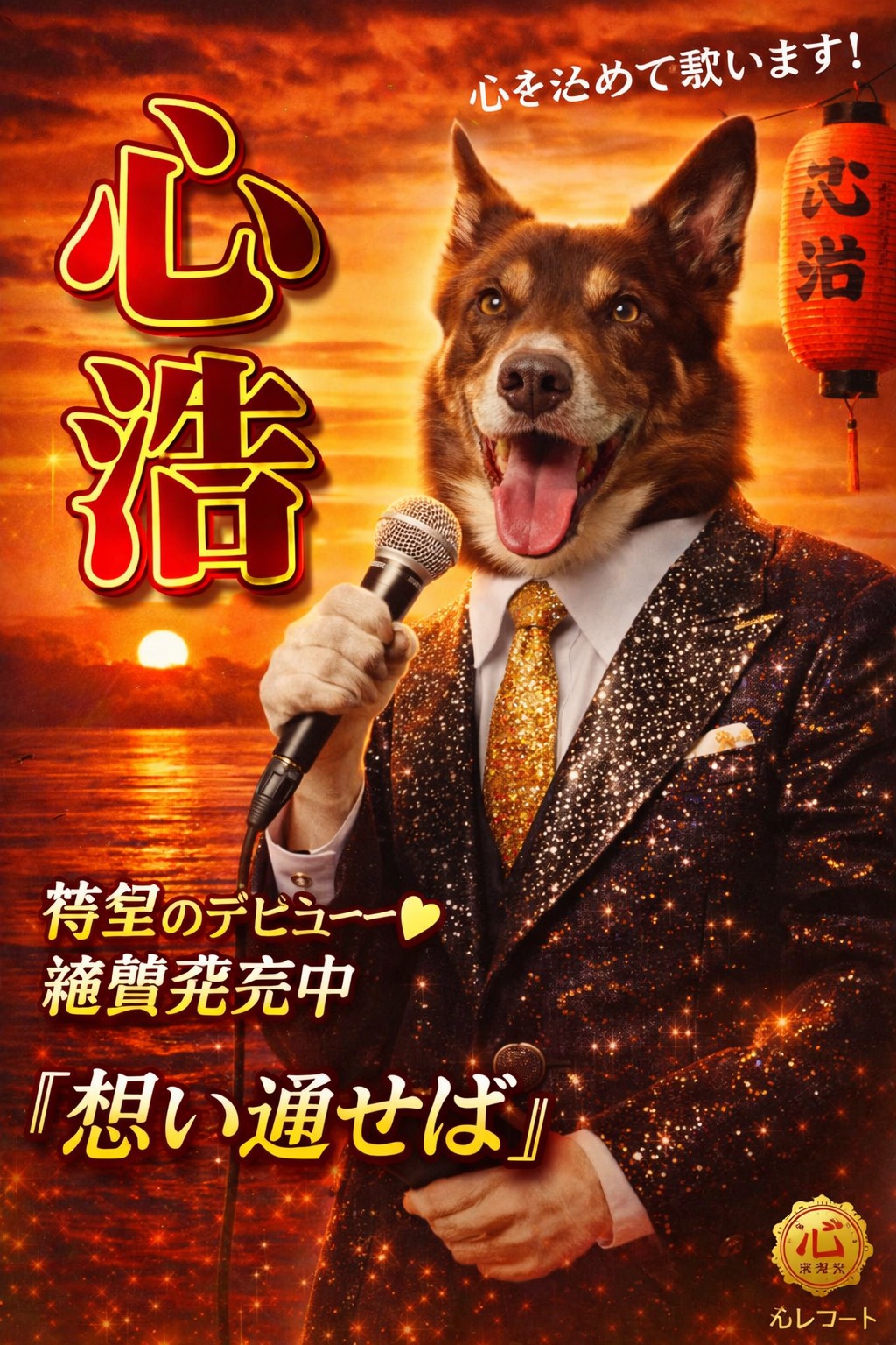で、AIにカンタのこの画像から心浩で演歌歌手ぽいポスター作ってってお願いしたんです
